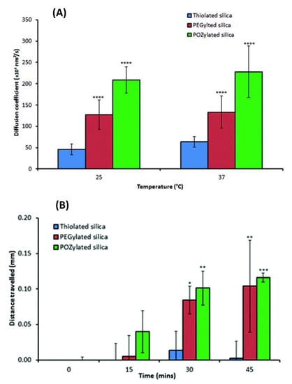 (A) Diffusion coefficients of thiolated, PEGylated and POZylated silica nanoparticles in 1% w/v porcine gastric mucin suspension determined by nanoparticle tracking analysis at 25 and 37 °C; Data show the mean ± standard deviation, where n = 9. (B) Penetration of thiolated, PEGylated and POZylated silica nanoparticles into porcine gastric mucosa. The values represent the means of 3 repeats ± standard deviation; all values were subtracted from values obtained for the blanks. *: p < 0.05, **: p < 0.01 and ***: p < 0.005. Reproduced from [96] with permission from the Royal Society of Chemistry.