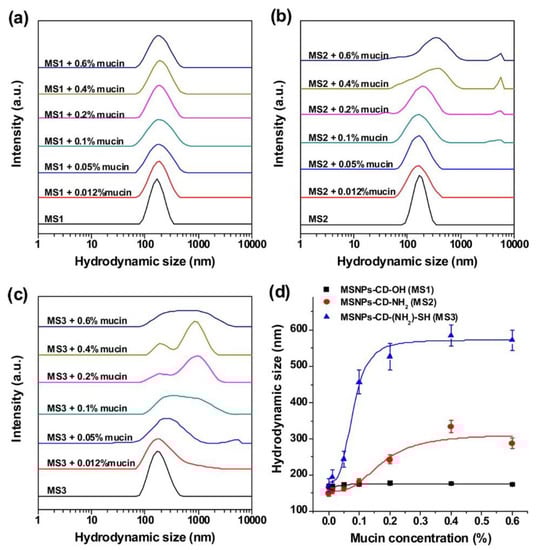 DLS size distribution of (a) MSNPs-CD-OH (MS1), (b) MSNPs-CD-NH2 (MS2) and (c) MSNPs-CD-(NH2)-SH (MS3) after mixing with different concentrations of mucin dispersed in acetate buffer solution (pH 4.5) for 30 min. (d) Effect of mucin concentration on mucin-particle interactions. Reprinted with permission from Zhang et al. [101]. Copyright (2014) American Chemical Society.