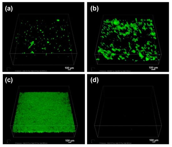Confocal microscopy volume view images of porcine bladder wall incubated in artificial urine (pH 6.1) containing fluorescein isothiocyanate (FITC)-labelled-(a) MSNPs-CD-OH, (b) MSNPs-CD-NH2, (c) MSNPs-CD-(NH2)-SH and (d) PBS (control) for 2 h. The green fluorescence indicates the presence of FITC-labelled MSNPs on the bladder wall. The data are representative images from three independent experiments. Scale bars are 100 μm in all images. Reprinted with permission from Zhang et al. [101]. Copyright (2014) American Chemical Society.