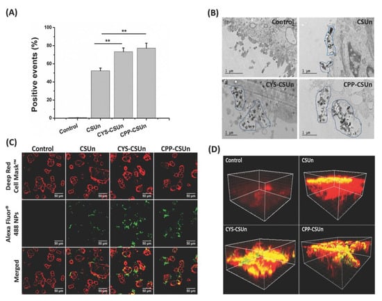 (A) Flow cytometry of cocultured Caco-2/HT29-MTX cells interacting with different silicon nanoparticles. **: the statistical significant difference (p < 0.01) between the CSUn and CYS-CSUn or CPP-CSUn nanoparticles. (B) TEM images of flat embedded ultrathin sections of cell monolayers interacting with different silicon nanoparticles. (C) Confocal microscopy images of different AlexaFluor TM (Life Technologies, USA) conjugated silicon nanoparticles interacting with Caco-2/HT29 coculture cells after a 3 h incubation at 37 °C; Red colour indicates cell membranes stained with CellMaskTM DeepRed (Life Technologies, USA); green colour indicates AlexaFluor TM conjugated nanoparticles; yellow colour indicates co-localization of nanoparticles and the cell membranes. (D) 3D confocal microscopy images of the cell monolayers interacting with different nanoparticles (red colour: mucus layer stained with wheat germ agglutinin (WGA)-AlexaFluor TM 594; green colour: AlexaFluor TM 488 labelled silicon nanoparticles; and yellow colour: co-localization of the mucus and the nanoparticles). Reprinted from Shrestha et al. [104] with permission of John Wiley & Sons.