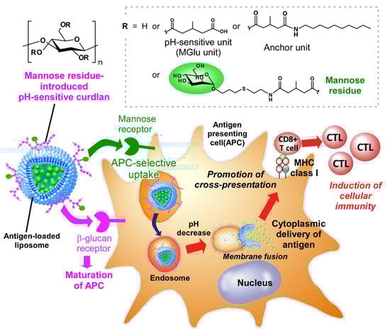 Design of mannose residue-introduced pH-responsive curdlan-modified liposomes for targeting to antigen presenting cell and cytoplasmic delivery of antigen towards induction of cross-presentation and cellular immunity.