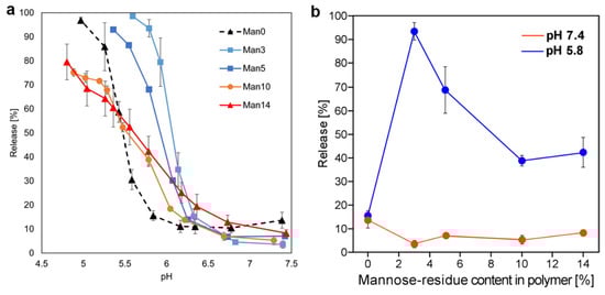 Next, pH-sensitivity of curdlan derivatives was evaluated by detection of pyranine release from curdlan derivative-modified liposomes. Reportedly, liposomes modified with MGlu-Curd-A (Man0) showed content release below pH 6.0, indicating that MGlu-Curd-A formed hydrophobic domain after protonation of carboxy groups in the polymer and destabilized liposomal membrane via hydrophobic interaction [] (Figure 2a). Interestingly, modification of mannose residues to curdlan derivative induced the content release at higher pH region than Man0-modified liposomes (Figure 2a). The existence of hydrophilic mannose residues in the polymer might rather promote participation of protonated MGlu units into hydrophobic parts of lipid bilayer. Especially, Man3-modified liposomes achieved >90% release of contents at pH 5.8, which corresponds to pH in the late endosome (Figure 2b). With increasing mannose residues, content release at weakly acidic region was suppressed. High introduced amounts of mannose residues might suppress efficient coil-to-globule transition of the polymers via steric hindrance, resulting in decrease of interaction with lipid membrane. Since these liposomes could induce the content release at weakly acidic pH corresponding to late endosome and lysosome (pH 5–6), these liposomes are expected to promote the content release at these intracellular organelles.