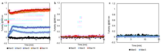 Next, the interaction of mannose-modified curdlan derivative-coated liposomes with lectin was investigated []. Liposome suspension was added to Concanavalin A (Con A)-containing buffer and turbidity change of the solution was analyzed (Figure 3a). In the case of Man0-modified liposomes, no turbidity change was observed, indicating that Curdlan backbone on the liposome surface has no interaction with Con A. In contrast, mannose-modified curdlan-coated liposomes exhibited significant increase of solution turbidity, in which Con A bearing four binding sites to mannose could induce aggregation among the liposomes. Especially, turbidity of Man10- or Man14-modified liposomes suspension immediately increased after addition to Con A-containing buffer. Whereas, presence of excess mannose completely suppressed turbidity increase for Man3- or Man14-modified liposomes in Con A-containing buffer (Figure 3b). These results clearly indicate that mannose residues on the liposomes surface can be recognized by Con A specifically. Furthermore, the presence of BSA showed no effect on turbidity change for these liposomes (Figure 3c), which also supports the specific interaction of mannose residues with Con A.