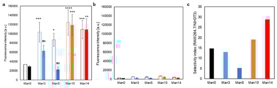 Fluorescence intensity of RAW264.7 cells (a) or NIH3T3 cells (b) treated with DiI-labeled liposomes modified with curdlan derivatives (0.1 mM) for 4 h at 37 °C in the presence (closed bars) or absence of FBS (open bars). (c) Fluorescence intensity ratio of RAW264.7/NIH3T3 cells. Statistical analysis was done using analysis of variance (ANOVA) with Tukey’s test. * p < 0.05; ** p < 0.01; *** p < 0.001; **** p < 0.0001 compared with Man0-modified liposomes with/without serum. ns: not significant.