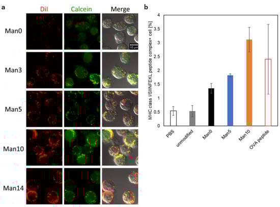 Because most curdlan derivative-modified liposomes could achieve cytoplasmic content release, cross-presentation efficacy was examined using OVA-loaded liposomes (Figure 5b). RAW264.7 cells were treated with OVA-loaded liposomes and then presentation of MHC I-OVA epitope peptide (SIINFEKL) on the cell surface was detected using antibody. As a positive control, OVA epitope peptide (SIINFEKL) bound onto corresponding MHC I molecules directly was detected. As shown in Figure 5b, cells treated with PBS or normal EYPC liposomes containing OVA showed low expression of MHC I/SIINFEKL complexes. In contrast, all curdlan derivative-modified liposomes exhibited high expression of MHC I/SIINFEKL complexes. Especially, Man14-modified liposomes possessed identical performance with the case of OVA peptide-treated cells, suggesting quite high efficacy of cross-presentation. Man0- and Man14-modified liposomes might achieve efficient cross-presentation mediated by “cytosolic pathway” because of their cytoplasmic delivery performance (Figure 5a and Supplementary Figure S5), whereas Man5-modified liposomes also showed comparable cross-presentation efficacy. This might result from mannose receptor-mediated uptake, which can promote another cross-presentation route via early endosome-mediated “vacuolar pathway” [].