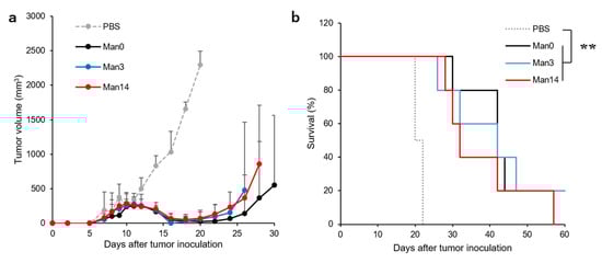 Finally, in vivo performance of curdlan derivative-modified liposomes was investigated. OVA-expressing tumor cells were inoculated to mice, then OVA-loaded liposomes were subcutaneously injected to tumor-bearing mice. When PBS was injected to mice, tumor volume increased significantly and all mice reached endpoint on Day 22 (Figure 6). In contrast, subcutaneous injection of curdlan derivative-modified liposomes strongly suppressed tumor growth (Figure 6a). In most cases, tumor size became not-detectable level and grew again after Day 20 (Supplementary Figure S6). Finally, all curdlan derivative-modified liposomes significantly extended the survival of mice compared with PBS-treated group (Figure 6b). After subcutaneous injection, these liposomes might be taken up by APCs because of their high selectivity (Figure 4c). Furthermore, curdlan derivatives on the liposomes also induced maturation of APCs [], which promotes the migration of these cells into lymph node. At lymph node, APCs presented OVA peptide onto MHC I molecules (Figure 5b) to induce OVA-specific CTLs. Activated CTLs migrated to tumor site and induced tumor cell killing. However, there is no statistical difference between liposomes with and without mannose modification. Even in Man0-modified liposomes, liposome uptake to antigen presenting cells in subcutaneous tissues might be enough because of high selectivity index (Figure 4c) and enough CTL responses might be induced for tumor regression. To see the effect of mannose modification, further high selectivity index might be required by changing the mannose density on the liposomes in addition to optimization of liposome dosage and injection timing. In all liposome-treated groups, tumor re-growth was observed (Supplementary Figure S6), which is consistent with the previous report []. These may result from the decrease of CTL activity after 2–3 weeks from injection, incomplete tumor cell killing due to dense extracellular matrix of tumor tissues, and induction of regulatory T cells against strong CTLs responses induced by curdlan derivative-modified liposomes. Further evaluations, such as combination with checkpoint inhibitors, cytokine gene delivery carriers, or other immunomodulatory molecules that can cancel immunosuppression in tumor tissues or can modulate tumor microenvironments, would improve the immunity-inducing performance of mannose-modified curdlan derivative-coated liposomes.