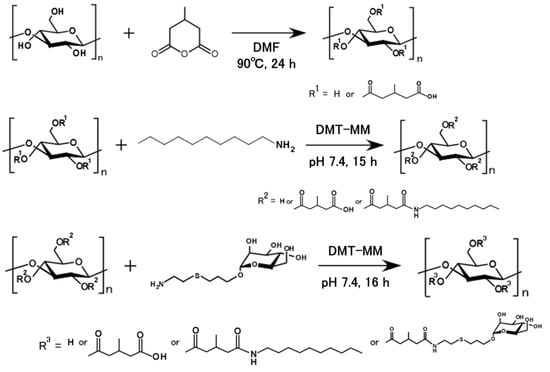 Briefly, 3-methylglutarylated Curdlan having an anchor moiety (MGlu-Curd-A, Man0) were synthesized via the esterification of curdlan using 3-methylglutaric anhydride and subsequent condensation with 1-aminodecane according to the previous literature [] (Scheme 1). Mannose residue (6-amino-4-thiahexyl α-D-mannopyranoside) was synthesized via thiol-ene reaction of allyl-α-D-mannopyranoside and cysteamine hydrochloride as shown in Supplementary Scheme S1 []. A given amount of 6-amino-4-thiahexyl α-D-mannopyranoside was reacted with carboxy groups of MGlu-Curd-A using DMT-MM at room temperature for 16 h with stirring (Scheme 1 and Supplementary Table S1). Obtained polymers were purified by dialysis against water. The product was recovered by freeze-drying and characterized using 1H NMR (Supplementary Figure S2). 1H NMR (400 MHz, D2O + NaOD) for hydrolyzed MGlu-Curd-A-Man: δ (ppm) 3.96–3.38 (br, glucose 2H, 3H, 4H, 5H, 6H, mannose 2H, 3H, 4H, 5H, 6H, Man-O-CH2-CH2-S-CH2-CH2-NH-), 2.77–2.65 (br, Man-O-CH2-CH2-S-CH2-CH2-NH-), 2.30–2.16 (br, -CO-CH2-CH(CH3)-CH2-), 2.08–1.94 (br, -CO-CH2-CH(CH3)-CH2-), 1.56–1.23 (br, decyl), 0.98–0.86 (m, -CO-CH2-CH(CH3)-CH2-).