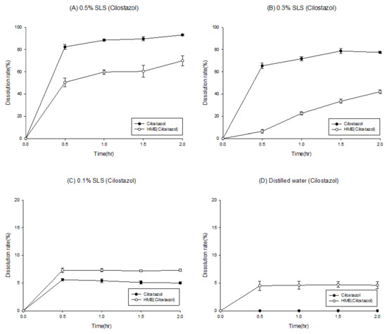 The release behavior of pure cilostazol and its extrudates was evaluated using the dissolution test. The dissolution tests were performed using a PTWS-121CTM 12 bowls dissolution tester with the USP apparatus II (37.5 ± 0.5 °C) at a paddle speed of 75 rpm. One liter of distilled water containing 0%, 0.1%, 0.3%, and 0.5% sodium lauryl sulfate (SLS) were used as the dissolution media. These media were developed according to the USP 42-NF37 “Cilostazol Tablets” [23]. Next, 5 mL of the dissolution fluid was collected, and the samples were diluted with ACN and MeOH (water 50%: ACN 35%: MeOH 15%) for HPLC analysis with a flow rate of 1 mL/min. The diluted sample was analyzed using the Agilent 1200 series HPLC system. A Fortis C18 column was used with a UV detector at a wavelength of 257 nm. Dissolution rate (%) was then calculated as follows.