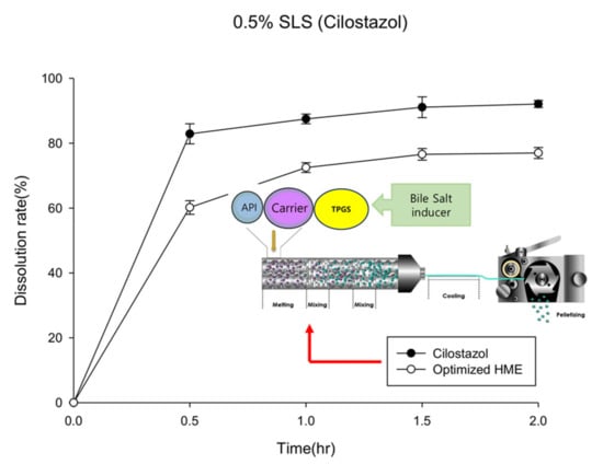 Based on in vitro tests, it is impossible to measure and predict the effect of inducing the release of bile salts into the small intestine. However, the induction or presence of bile salts has a profound effect on the bioavailability of cilostazol (Figure 3). The addition of lipids to the formulation, to induce bile salts in the intestine, is expected to reduce the degree of individual differences and enhance bioavailability [27,29]. In this study, a lipid-based formulation was prepared using the HME technology based on the results of the PBPK simulation. HME encapsulated the API with minimum lipid amounts evenly distributed under optimized temperature and pressure, allowing the surfactant induction within a short time. Consequently, we prepared a hot-melt extrudate with an even distribution of the vitamin E derivative, TPGS®, so that the solid-state extrudate could be maintained at room temperature and produced a lipid-enclosed formulation with a small particle size. Finally, the extrudates were frozen and crushed.