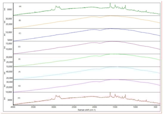 Raman spectroscopy: (A) cilostazol, hot-melt extrudate prepared at (B) 120, (C) 140, (D) 160, (E) 180, (F) 200 and (G) 220 °C, (H) physical mixture.