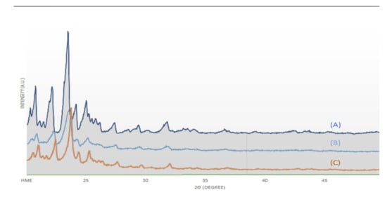 X-ray diffraction (XRD) images: (A) cilostazol, (B) physical mixture, and (C) optimized hot-melt extrudate.
