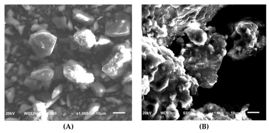 Raman spectroscopy, XRD, and SEM measurements were performed to determine the changes in cilostazol during the HME process. These results are shown in Figure 5, Figure 6 and Figure 7, respectively. Raman spectroscopy (Figure 5), which focuses on the particle surface, demonstrated cilostazol peaks only in the cilostazol powder (A) and the physical mixture (H) without the HME process. On the other hand, cilostazol was not observed on the surface of all the extrudates when the hot-melt extrudate was produced by altering the processing temperature from 120 to 220 °C. Ideally, the lipid matrix uniformly wraps around the particle surface [31]. For better stability, the lowest and optimized temperature of 120 °C was set as the manufacturing temperature [26]. Furthermore, hot-melt extrudates were not produced at temperatures below 120 °C. The XRD data (Figure 6) indicated that the cilostazol crystallinity was maintained in all cilostazol powders, physical mixtures, and hot-melt extrudates. However, the SEM images demonstrated that the pure cilostazol (Figure 7A) and hot-melt extrudate (Figure 7B) were distinct. After the HME process, all the angular crystal structures of cilostazol were well mixed with the lipid. In other words, the cilostazol crystallinity was maintained even after the hot-melt extrusion process and cilostazol was made to clusters with lipid. Thus, it is possible that this formulation maintained the stability of the drug [32,33,34] and may induce adequate bile secretion in the small intestine.