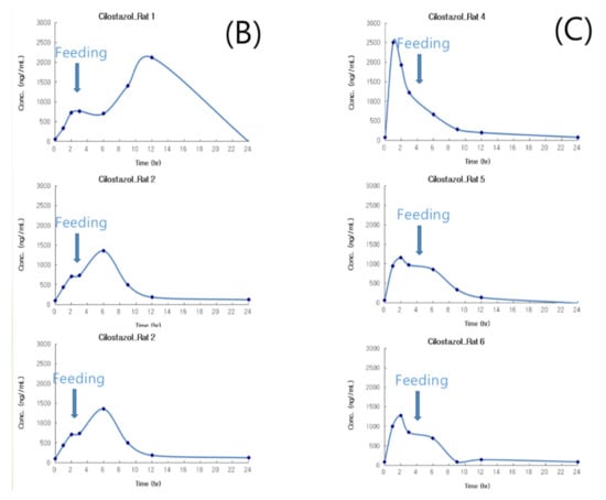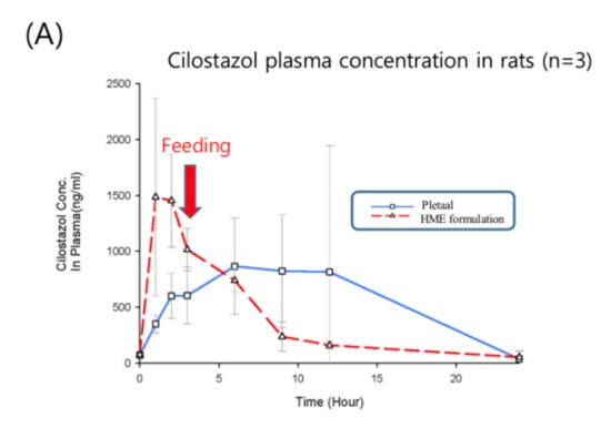 Pletaal® treatment can be problematic as individual PK differences were considerably large between the three rats. This large deviation could lead to adverse effects and challenges in administering the appropriate cilostazol dose. In the optimized hot-melt extruded (PBPK simulation-based) formulation, Cmax occurred at approximately the same time and no individual differences more than two and half times were observed. An individual difference occurring around twice the value was considered in the acceptable range based on previous reports indicating that gastrointestinal surfactant concentrations differ by as much as five times with the same high-fat diet [27]. In vitro results of the optimized hot-melt extruded (PBPK simulation-based) formulation showed that the dissolution rate was not improved compared to that of the original formulation (Figure 4); however, this in vivo result demonstrated that the rate of absorption of the optimized formulation was higher with lower deviation than that of the marketed formulation. Furthermore, administration was regardless of meal consumption.