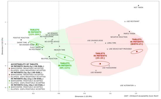 Tablets appeared to be "positively accepted" in children aged 6 and over, while not in children under 6 (Figure 1). Indeed, the barycenters of the evaluations of tablet intake in children from 6 to 11 as well as 12 and over, along with the confidence ellipses surrounding them, were fully located in the green area of the acceptability map. This appeared not to be the case for the children from 3 to 5, or those under 3, which were fully located in the red part of the acceptability map.