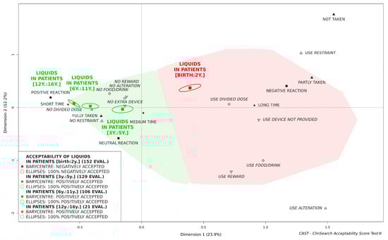 Focusing on those children under 3, syrup tended to be better accepted than other oral liquid pharmaceutical products. Indeed, the barycenter of the 37 evaluations of syrup intake, along with 79% of the confidence ellipses surrounding it, were positioned in the green area of the map. Conversely, the barycenters of the 26 evaluations of effervescent tablets, 33 evaluations of powders for oral solution/suspension, 20 evaluations of drops for oral solution, and 36 evaluations of oral solutions/suspensions were all located in the red area of the map.