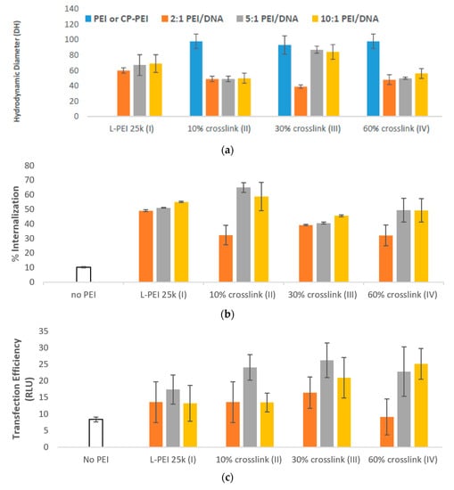 The optimal mixing ratio of PEI/TAC and DNA was evaluated by mixing the DNA with PEI/TAC at various weight ratios (2:1, 5:1, 10:1 PEI/TAC:DNA). Particles formed with PEI/TAC were generally smaller than those prepared with unmodified PEI, indicating a more condensed particle (Figure 3a). Smaller polyplex particle sizes were expected to positively influence cellular uptake. Surprisingly, increased degrees of crosslinking did not drastically alter polyplex size. In most cases, the hydrodynamic diameter of the particle was reduced upon PEI/TAC/DNA complexation (~50 nm), indicating polyplex formation. L-PEI 25k condensed DNA to 60–70 nm (Figure 3a).