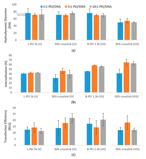 The decreased particle size of 30% crosslinked B-PEI 1.3k (VIII, Figure 4a) afforded enhanced cellular uptake of PEI/TAC/DNA polyplexes (65% for 5:1 w/w mixing ratio) relative to unmodified PEI (58% uptake at the same ratio). The 30% crosslinked L-PEI 5k (VI), which did not display reduced particle size, displayed no advantage regarding cellular uptake relative to unmodified PEI, as neither afforded more than 47% uptake (Figure 4b).