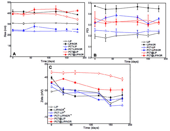Stability study of the formulations with and without 0.2% NOR (w/v) in terms of size (A), PDI (B), and zeta potential (C) during 6 months of storage at 4 °C, n = 3. Statistical methods ANOVA/Tukey were used; * = p < 0.05.