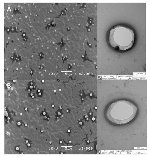 FE-SEM (left) and TEM (right) images of PCT@LIP (A) as control and PCT@LIP/NOR (B) containing 0.2% NOR (w/v) formulations. The used magnifications are displayed in the images.