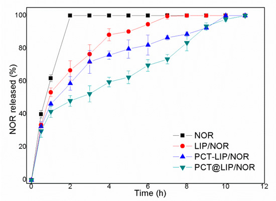 In vitro release profile of norfloxacin (0.2%), free or encapsulated in LIP/NOR, PCT-LIP/NOR, and PCT@LIP/NOR samples, at 37 °C, n = 5.