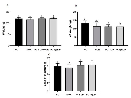 In vivo toxicity study in terms of chicken embryo weight (A), YS weight (B) and loss of moisture (C), in chicken embryos after treatment with norfloxacin (20 μg/mL) or formulations containing 20 μg/mL NOR. NC = negative control, NOR = 20 μg/mL norfloxacin solution, PCT-LIP = liposome encapsulating NOR (20 μg/mL) blended with pectin solution and PCT@LIP = pectin-liposome formulation containing NOR (20 μg/mL), n = 10. Different letters indicate significant difference (p < 0.05) and values are expressed as mean ± SEM (One-way ANOVA followed by Tukey test).