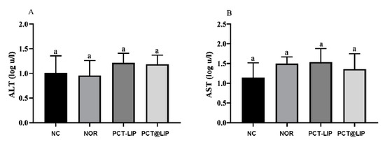 ALT (A) and AST (B) levels in AF of chicken embryos after treatment with free norfloxacin (NOR) or encapsulated in the formulations: PCT-LIP = conventional liposomes plus NOR at 20 μg/mL blended with pectin solution, PCT@LIP = pectin-liposomal formulation containing NOR at 20 μg/mL. NC = negative control, n = 10. Data expressed as mean ± SEM. Statistical test: One-way ANOVA/Tukey (p < 0.05).