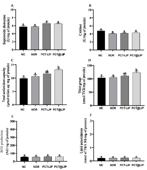 Levels of oxidative stress biomarkers in terms of superoxide dismutase (A), catalase (B), total antioxidant capacity (C), thiol groups (D), ROS production (E) and lipid peroxidation (F), in embryos liver chicken after treatment with norfloxacin (NOR, 20 μg/mL) or formulations containing 20 μg/mL NOR: PCT-LIP = liposomes encapsulating NOR and blended with pectin solution and PCT@LIP = hybrid liposomal-pectin formulation containing NOR. NC = negative control; n = 10. Data expressed as mean ± SEM. Statistical tests: One-way ANOVA/Tukey (p < 0.05).