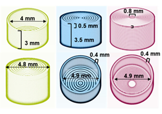 Fused deposition modeling (FDM) was used to fabricate the cup and lid submodular components. Digital models of the cup and lid were created as ‘.stl’ files using Autodesk® TinkerCAD™ (Autodesk, Inc., San Rafael, CA, USA). The generated ‘.stl’ file was subsequently imported into Simplify3D® (version 4.1.1., Simplify3D LLC, Cincinnati, OH, USA) for control of printing parameters and subsequent printing. Critical cup and lid model dimensions are described in Figure 3.