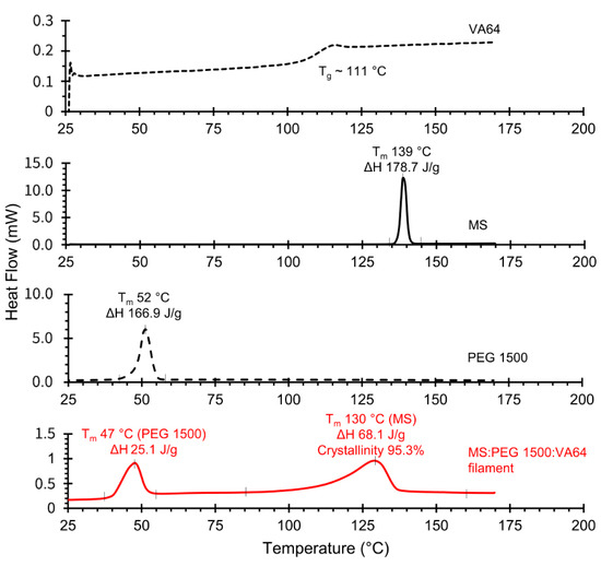 The cores are the dose-controlling features of all module variants and were melt molded from melt extruded drug-containing filaments. Figure 4 shows the thermal transitions, which occurred between 25 °C and 170 °C, of the raw materials for melt extrusion and the melt extruded filament (40% w/w MS: 20% w/w PEG1500: 40% w/w VA64).