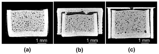 Computed microtomographs of longitudinal sections through the midline of: (a) MV1; (b) MV2; (c) MV3 with 0.4 mm orifice.