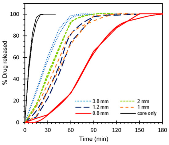 A reduction in the drug-containing core dimensions with respect to time was observed with complete drug release evident once the entire core had dissolved. This was expected from a core matrix comprising a water-soluble drug in a water-soluble PEG1500 and VA64 matrix. According to the product design, rapid release from the core was intended to allow the release rate-limiting features to be surface area of the exposed core face, lid thickness, and orifice size for MV1, MV2, and MV3, respectively. As expected, Figure 6 shows that drug release from MV1 (3.8 mm diameter in Figure 6), with a T80 of 43 min, was indeed slower than that of the free core due to the reduced surface area available for hydration and subsequent drug dissolution. Figure 6 also illustrates drug release kinetics as a function of lid orifice size, which was used to govern MV3 selection. Drug release kinetics with progressively smaller orifice size revealed slower (T80 of 110 min) and mechanistically distinct release kinetics at an orifice size of 0.8 mm, whereby initial drug release increased with time, in contrast to the initial zero-order release exhibited by MV1. Compared to the 0.8 mm orifice size, orifice sizes ranging from 1–2 mm (T80 of 52-65 min) all had similar release kinetics to MV1 indicating that the contribution of initial hydration differences to the full release mechanism was not significant at this range of orifice sizes. Consequently, an orifice size of 0.8 mm was selected for MV3. MV2 was designed to be identical in release rate to MV1 after an initial lag period provided by the dissolution time of the water-soluble PVA lid. Although the thickness of the lid would influence the duration of the lag phase, a lag phase of any duration would differentiate MV2 release kinetics from that of MV1 and MV3. Consequently, no preliminary drug release tests were required for the selection of MV2.