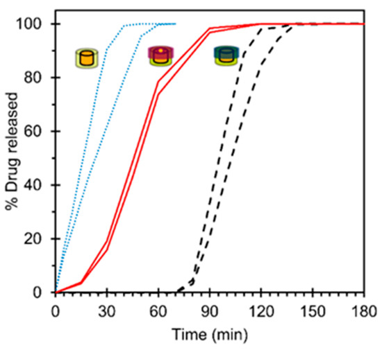 The solid lines represent minimum and maximum drug release kinetics for the dosage form variants (black) and module variants (grey). Three unique release profiles are shown for the dosage form variants comprising two identical module variants, analogous to that of the single module variants. The dose released (mg) corresponds to the complete drug release (100%) in all cases. Furthermore, Figure 8 also confirms that, in the absence of interactions between individual modules, both dose and drug release kinetics from the dosage forms are a predictable net effect of the dose and drug release kinetics of their constituent modules in all cases.