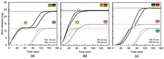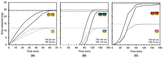 Dose released (mg) from dosage forms comprising two identical module variants: (a) MV1+MV1; (b) MV2+MV2; and (c) MV3+MV3. As a reference, solid grey lines indicate dose released from single module variants. Data is presented as the minimum and maximum of n = 2 samples. Mean T50 and T80 values for the dosage forms are displayed in the bottom right of each figure.