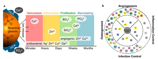 - Miguez-Pacheco, V.; Hench, L.L.; Boccaccini, A.R. Bioactive glasses beyond bone and teeth: Emerging applications in contact with soft tissues. Acta Biomater. 2015, 13, 1–15. [Google Scholar] [CrossRef]