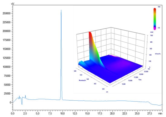 The flow rate through the column for the analysis was set at 1 mL/min, with column thermo-regulation set to a temperature of 30 °C. The injection volume was of 20 µL. The quantification wavelength was set up at 210 nm. BP detection was realized by screening with a diode array detector (DAD) detector from 190 nm to 800 nm.