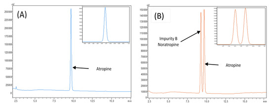 For each unit, atropine was quantified and BPs were detected using the liquid chromatography (LC) method described by the European Pharmacopeia, Atropine monography [33]. The LC system that was used was a Prominence-I LC2030C 3D with diode array detection (Shimadzu France SAS, Marne La Vallée, France), and the associated software used to record and interpret chromatograms was LabSolutions® version 5.82. The LC separation column used was a C18 Synergi® Fusion-RP 80 (150 × 4.6 mm, 4 µm) with an associated guard column (Phenomenex, Le Pecq, France).