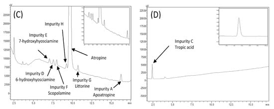 Chromatograms of atropine impurities at 210 nm: (A) reference atropine chromatogram, (B) chromatogram of the atropine impurity B CRS solution, (C) chromatogram of atropine for the peak identification CRS (containing impurities A, D, E, F, G, and H) solution, and (D) chromatogram of the tropic acid R (impurity C) solution. The insets represent a close up of the chromatograms.