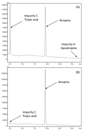 The method used for the quantification of atropine was the one described in the European Pharmacopeia, atropine monography, and the use of atropine impurities allowed the identification of 2 breakdown products that appeared during forced degradation to validate the method as being stability-indicating: tropic acid (impurity C) and apoatropine (impurity A). These two compounds have already been widely described as being the main instability by-products occurring during either hydrolysis (tropic acid and tropine) or dehydration (apoatropine) [39]. Our forced degradation results are coherent with previously described data suggesting higher stability in acidic conditions and lower half-life in neutral (pH 7–8) or alkaline (pH > 8) conditions [40]. Using the same chromatographic method, we were also able to quantify tropic acid, which presented a retention time of 2.5 min in the absence of a phosphate buffer. However, in the presence of the phosphate buffer used in the formulations, its retention time was reduced to about 2 min. This could be explained by a local modification of pH induced by the buffer (pH of the formulation = 6.1) leading to tropic acid being deprotonated (the pKa of tropic acid being of 4.3 [41]) and thus being less retained by the stationary C18 column than when injected without the buffer, as the pH will therefore be imposed by the mobile phase (pH 3.9) and tropic acid will be in unionized protonated form. The choice of the quantification wavelength at 210 assured maximum sensitivity with minor influence of the mobile phase, and the absence of dilution of the formulations before chromatographic analysis also meant that we were able to detect minute quantities of breakdown products in the ophthalmic solutions.