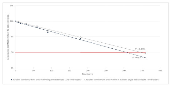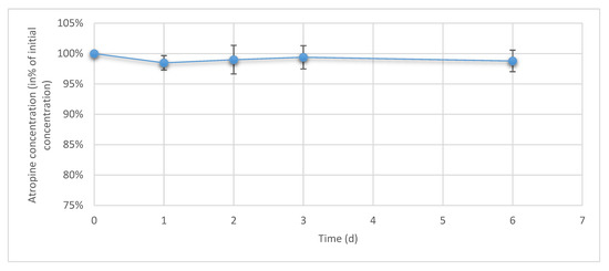 For all studied conditions, mean atropine concentrations did not vary by more than 5.7% of mean initial concentrations (as presented in Figure 4). By extrapolation of the degradation rate using a linear regression, it could be estimated that atropine concentrations would remain higher than 90% of the original concentration for about 300 days.