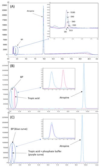 Chromatograms of (A) the increased area under curve of the breakdown product, (B) superposition of chromatograms of tropic acid diluted in water and an atropine solution containing the breakdown product, and (C) superposition of chromatograms of tropic acid diluted in phosphate buffer and an atropine solution containing the breakdown product.
