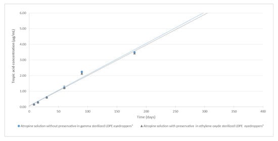 Stability studies are of vital importance to be able to assign a shelf-life to medications; however, they must be conducted properly to avoid any misinterpretation or incomplete conclusions [54]. Several guidelines exist, such as those prepared by the International Conference on Harmonisation for stability studies [37], by the US Pharmacopoeia [55], or by international consensus by learned societies [38,56,57]. In our case, we validated a European Pharmacopoeia monography initially designed for the quality control of API atropine as being stability-indicating and capable of detecting and identifying potential breakdown products. Our results are concordant with previously published data concerning the stability of low concentration atropine solutions with regards to the concentration of atropine; however, we showed that atropine degradation is present and does lead to increased concentrations of tropic acid, a known breakdown product. Very little information is available about the toxicity of tropic acid and even less is available about any potential ocular toxicity. In the human body, atropine metabolism produces small (3%) amounts of tropic acid [58] and atropine is mostly excreted unchanged in the urines. During ophthalmic administrations in rabbits, it has been shown that atropine has good ocular bioavailability via both transcorneal and transconjunctival-scleral routes [59]. Unfortunately and to the best of our knowledge, atropine metabolism in the eye has not been studied despite there being a clear incentive to do so, like for other drugs [60]. There is therefore very little information available about the possibility of the natural formation of tropic acid in the eye after atropine topical application or, as stated previously, about tropic acid’s ophthalmic toxicity. In this work, we found that concentrations of tropic acid reached 3.5 µg/mL in the atropine formulations we tested, those concentrations being 6 to 11 times lower than the quantities we also detected in commercial atropine ophthalmic formulations available on the marked. As such, it could be considered safe to administer the tested formulations after 6 months of conservation.