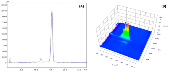 The retention time of Amphotericin B was of 15.49 ± 0.18 min (average ± IC95%) (Figure 2). The chromatographic method used was found linear for concentration ranging from 15 to 35 µg/mL with a mean determination coefficient R2 equal of 0.999. Average regression equation was y = 73,833x − 73,492 where x is the amphotericin B concentration (µg/mL) and y the surface area of corresponding chromatogram peak. Interception was not significantly different from zero.