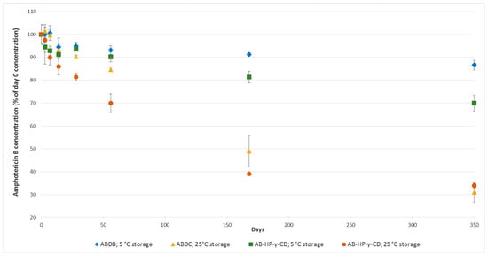 In this study, we show that amphotericin B solubilised in HP-γ-CD is not as stable as conventional amphotericin B deoxycholate, as amphotericin B loss reached nearly 10 and 20% after respectively 56 and 168 days of storage at 5 °C, whereas for convention ABDC formulation, the loss was of only of 6.89% and 8.70% for the same storage times.