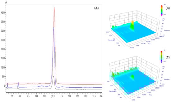 (A) Chromatograms at 408 nm amphotericin B solubilised in 2-hydroxypropyl-γ-cyclodextrins (diluted 1/100th to the theoretical concentration of 25 µg/mL) at day 0 (red curve), after 168 days at 5 °C storage (blue curve) and 25 °C (black curve); with diode array detector screening after 168 days at 5 °C (B) and at 25 °C (C). µV and mAU: units of intensity of signal measured by the UV-visible detector.
