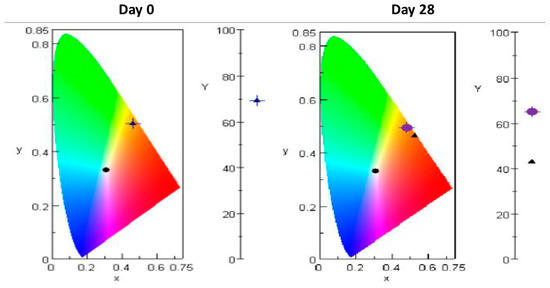 Chromaticity (xy diagram) and luminance (Y) results of the HP-γ-CD amphotericin B formulation containing 0.5 mg/mL ascorbic acid at day 0 and day 28. Blue cross: day 0 results. Purple cross target: storage at 5 °C. Black triangle: storage at 25 °C.