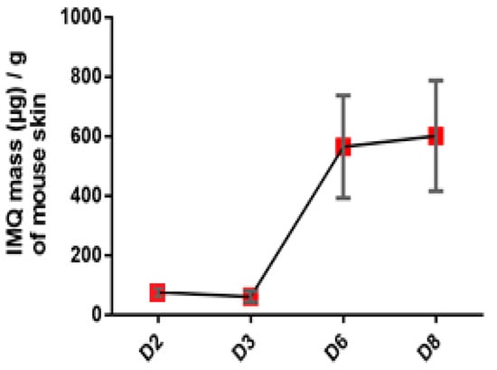 Evaluation of IMQ concentration in mouse skin in the course of IMQ-induced psoriasis-like dermatitis. Values are presented as mean ± SD.