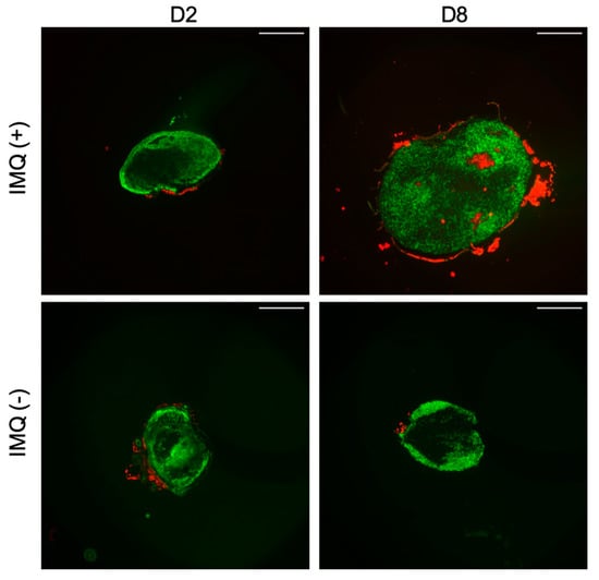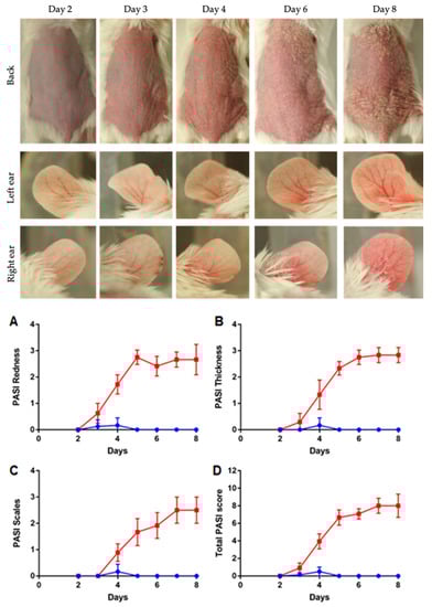 The same protocol as employed by van der Fits et al. [] was followed for the induction of psoriasis-like lesions in mice. Briefly, the mice were shaved and depilated on their back using a Brav Mini Clipper razor (Wahl, Sterling, ILL, USA) and commercially available depilatory cream (Veet®, Reckitt Benckiser Group, Slough, England). The experimental group was treated daily with application of 62.5 mg of commercially available 5% IMQ cream (Aldara, MEDA Pharmaceuticals, Solna, Sweden) on the depilated back and right ear of each mouse. Thus, the total mass of IMQ distributed daily to each mouse is 3.125 mg. This dose has been empirically determined [] and already demonstrated to cause reproducible and optimal skin inflammation in this model in various publications [,,,,]. The control group was treated similarly with Lanette cream containing cetyl stearyl alcohol (BASF, Ludwigshafen, Germany). The animals were divided into five groups (n = 4), including three experimental mice and one control mouse, for each day of euthanasia (day 2, 3, 4, 6 and 8).