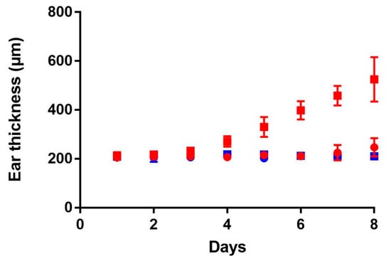 The application of IMQ on the right ear for 8 consecutive days caused a continuous increase in thickness starting from day 5 until the end of the experiment due to the inflammation process (red squares, Figure 3). Contrarily, on the left ear, control ear without treatment, no change in ear thickness was observed for 8 days (red rounds). For the control group, both right (blue squares) and left (blue rounds) ear measurements were done, and no change was observed for 8 days.