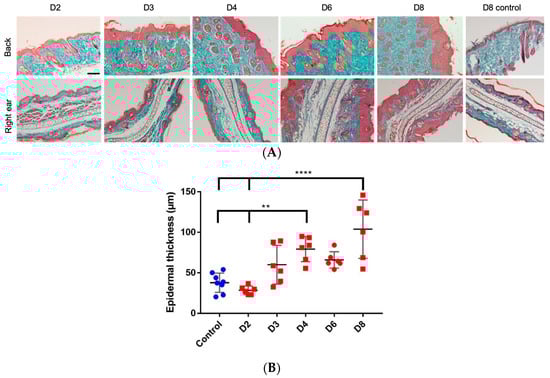 (A) Histological examination by Masson’s trichrome staining of back and right ear samples (scale bar = 100 µm for each image). (B) Measurement of epidermal back thickness for 8 days of IMQ application; measurements were made by two different persons on 3 images, for each day (n = 3) and statistically analyzed using one-way ANOVA followed by Tukey’s multiple comparison test. **: p < 0.01; ****: p < 0.0001.