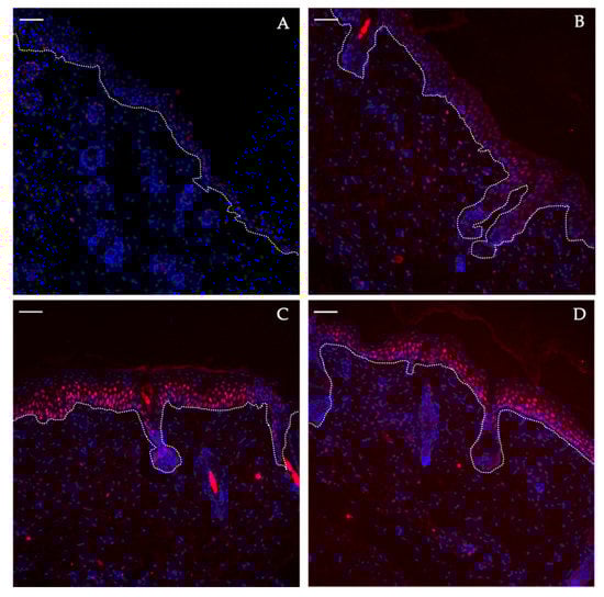 pSTAT3 staining evaluation on dorsal skin in the course of IMQ-induced psoriasis-like dermatitis at day 2 (A), day 4 (B), day 6 (C) and day 8 (D). The dotted white line represents the dermo-epidermal junction with epidermis upwardly. pSTAT3 protein appears in red and cell nuclei in blue. Scale bar = 50 µm.